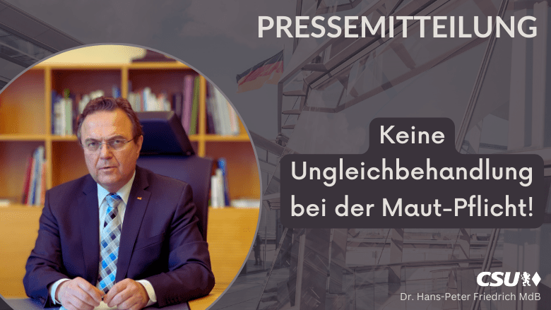 Zum 1. Juli 2024 tritt die Ausweitung der Mautpflicht auf Fahrzeuge mit einer technisch zulässigen Gesamtmasse von mehr als 3,5 Tonnen in Kraft. Von der sog. „Handwerkerausnahme“ sind viele gewerbliche Tätigkeiten ausgeschlossen. Dazu erklärt der hochfränkische CSU-Bundestagsabgeordnete Dr. Hans-Peter Friedrich: